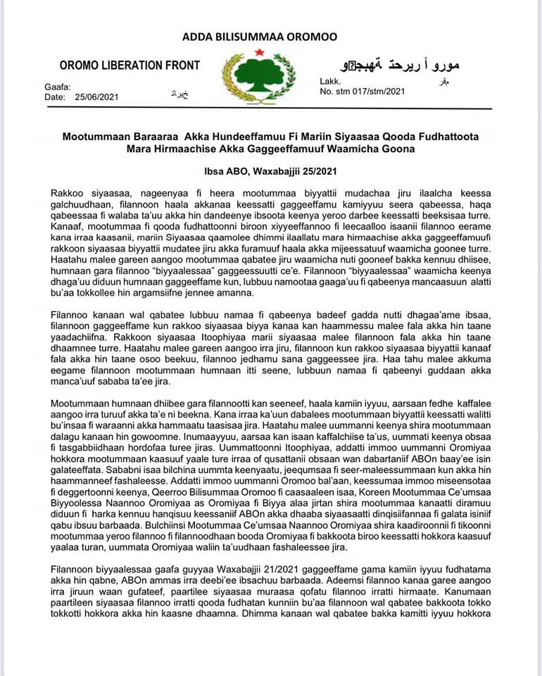 Finally, we want to reiterate that OLF is always willing to work with all stakeholders to restore peace and stability in the country and engage in inclusive political dialogue and setting road map to peaceful resolution of outstanding political problems.